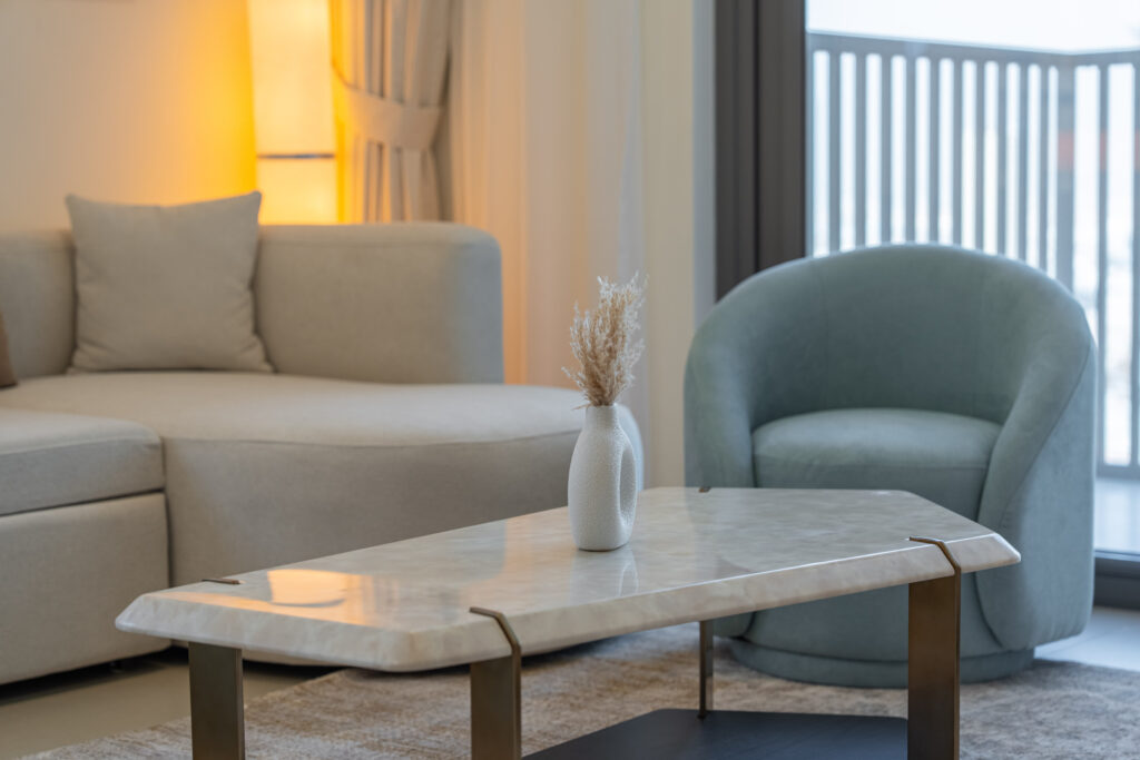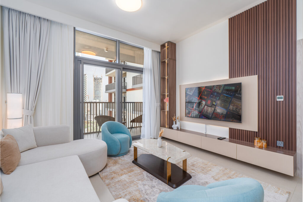 • Bright living area with comfortable seating and smart TV