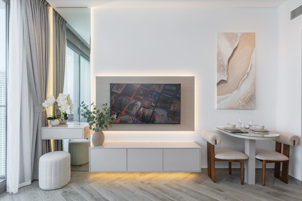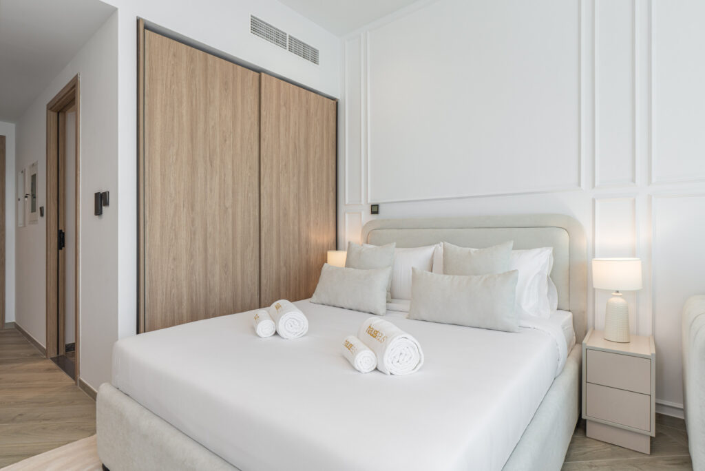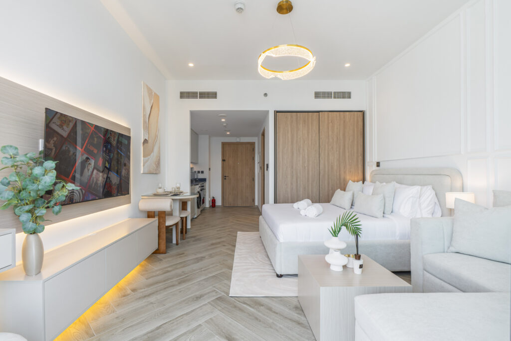 Perched above the city, this contemporary studio offers stunning Dubai Canal views, creating a serene and scenic backdrop to your stay. Designed with modern furnishings and an open-plan layout, the apartment maximises natural light while providing a bright and inviting space—perfect for solo travellers or business guests seeking comfort and style in the heart of the city.