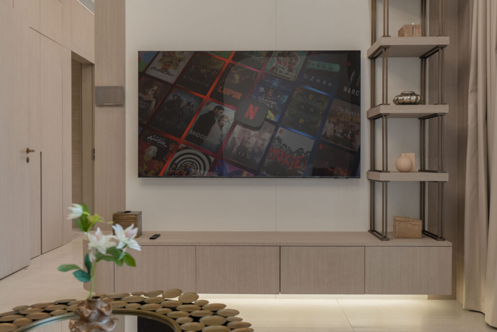 • Stylish living area with a comfortable sofa and smart TV