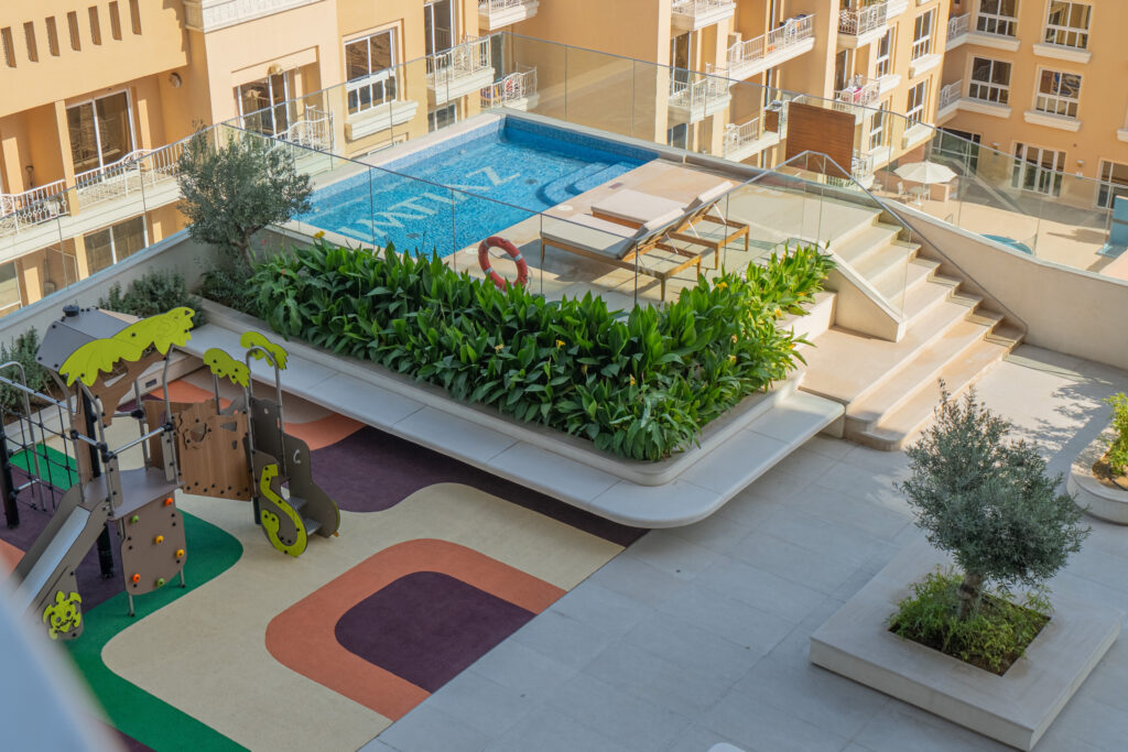 • Balcony with direct views of the swimming pool, BBQ area, and kids’ play area