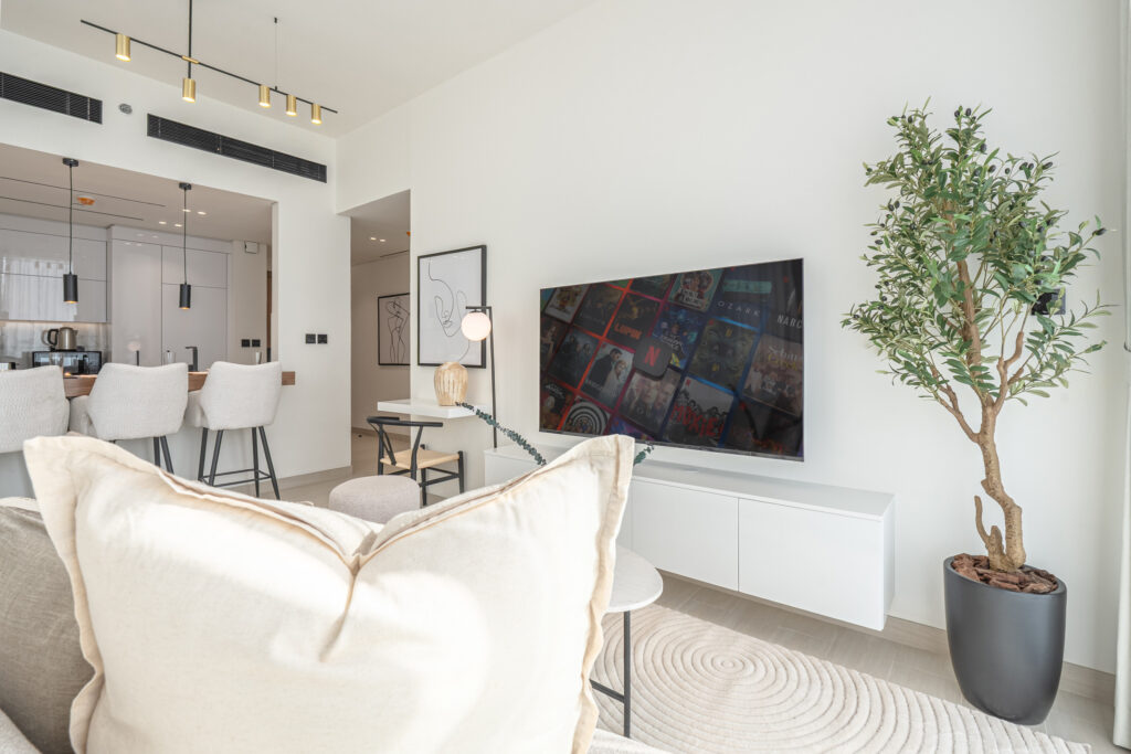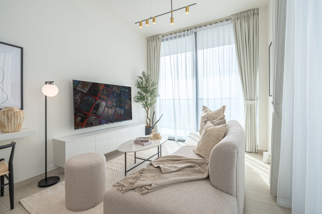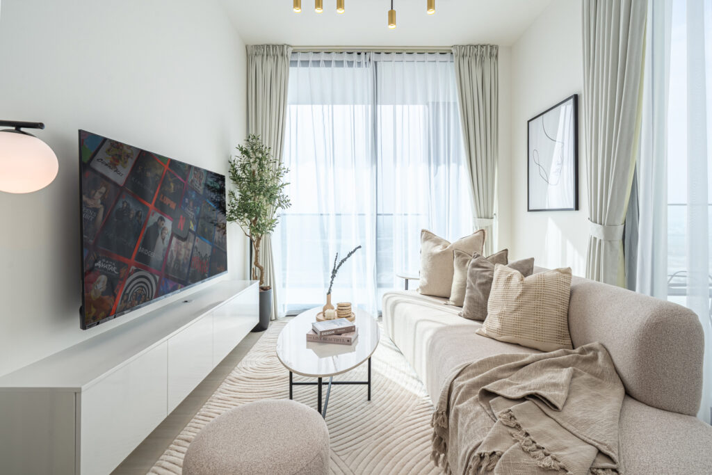 • Deluxe living area with a comfortable sofa and smart TV