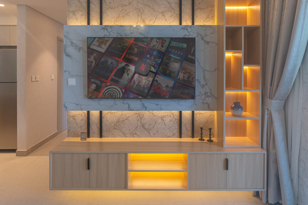 • Expansive living room with elegant seating and smart TV