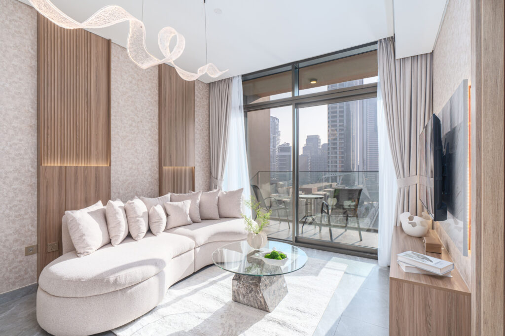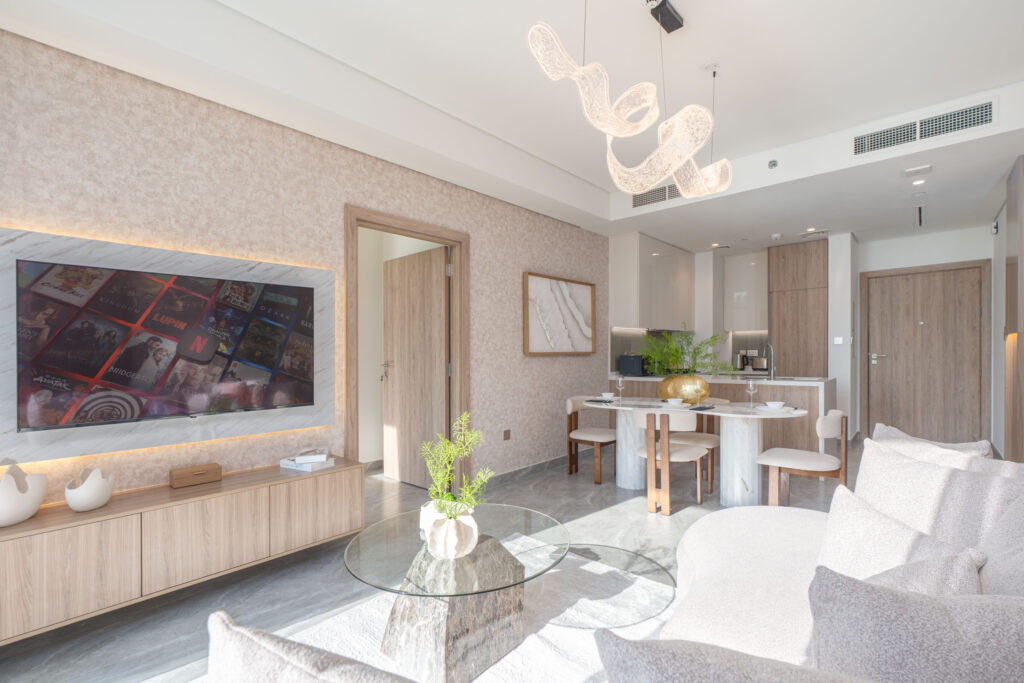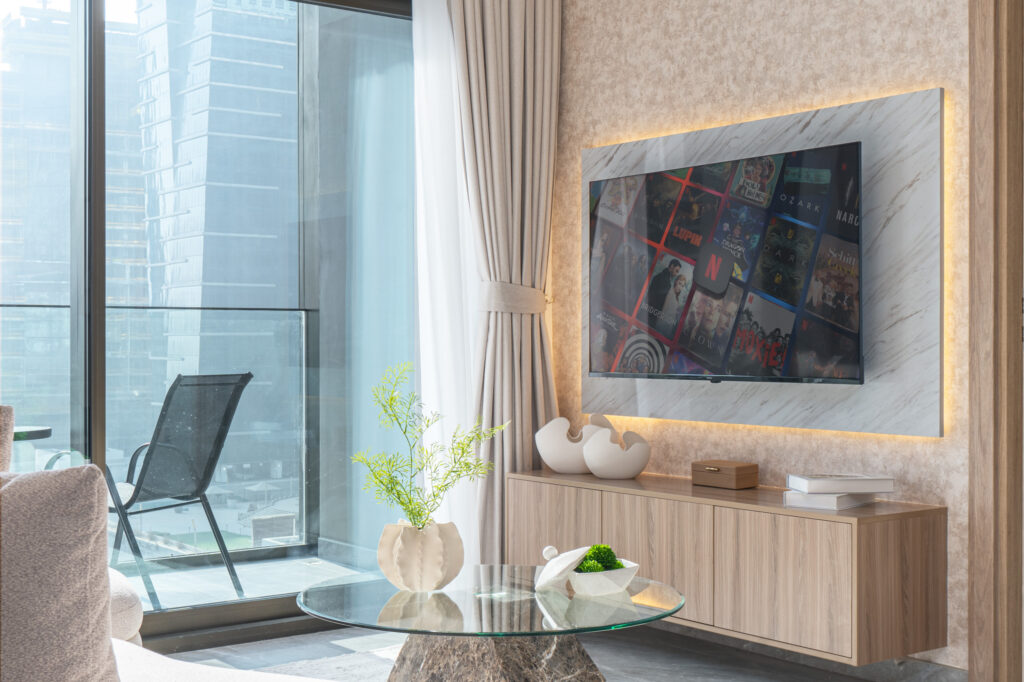 • Stylish living area with plush seating and Smart TV