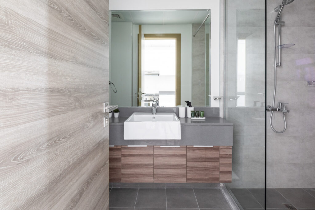 • Modern bathroom with walk-in shower