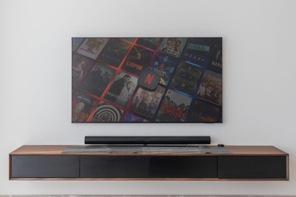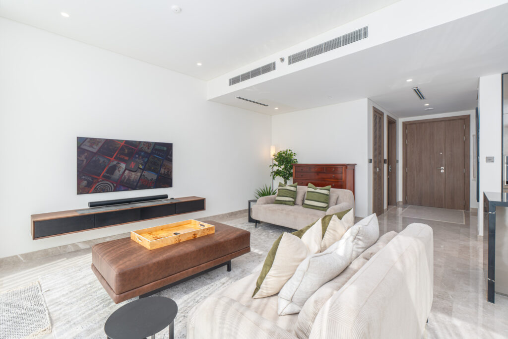 • Elegant living area with stylish furnishings, smart TV, and modern décor