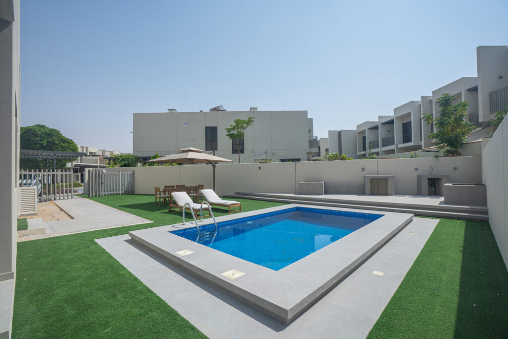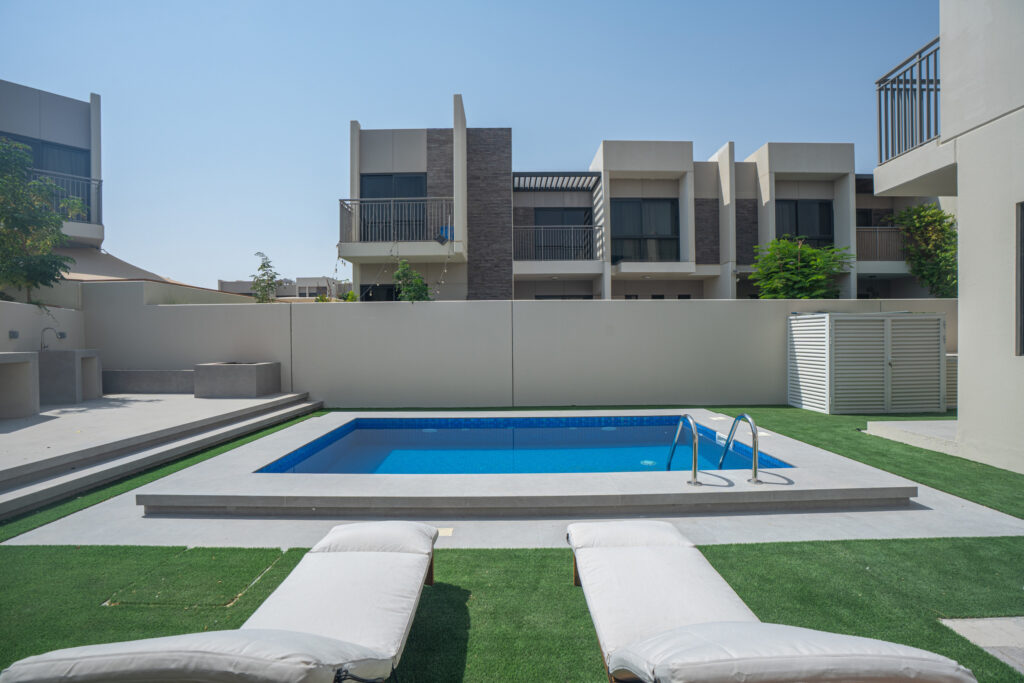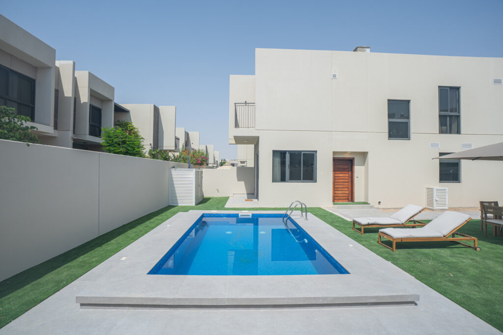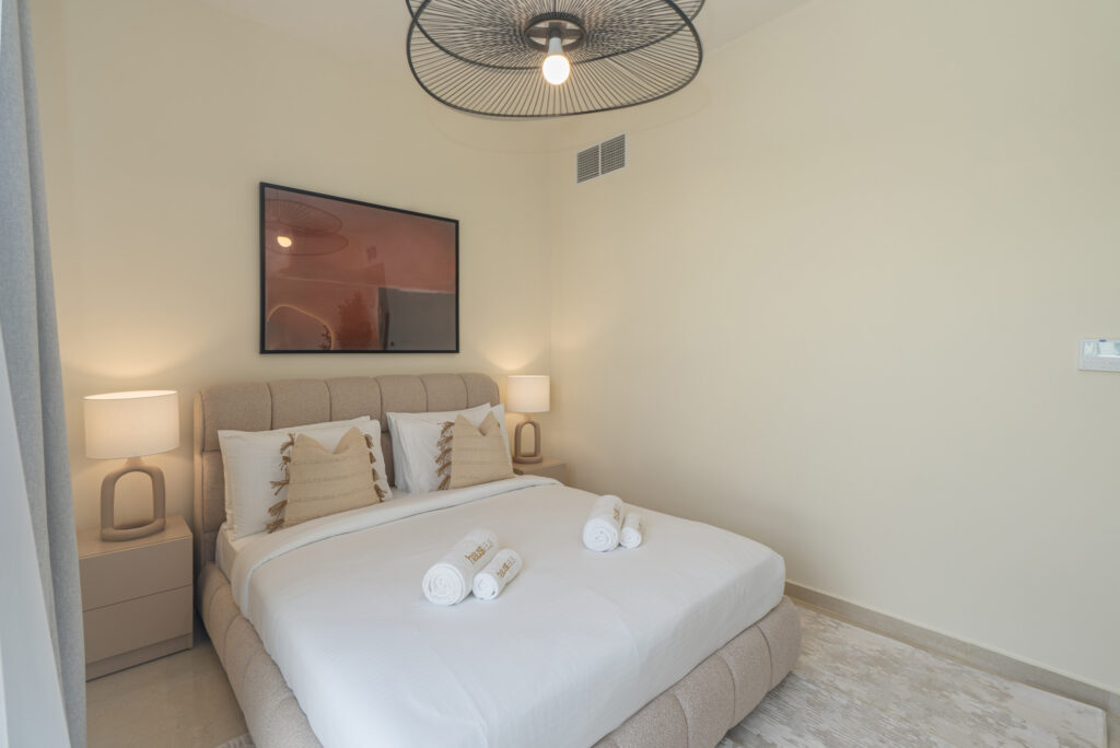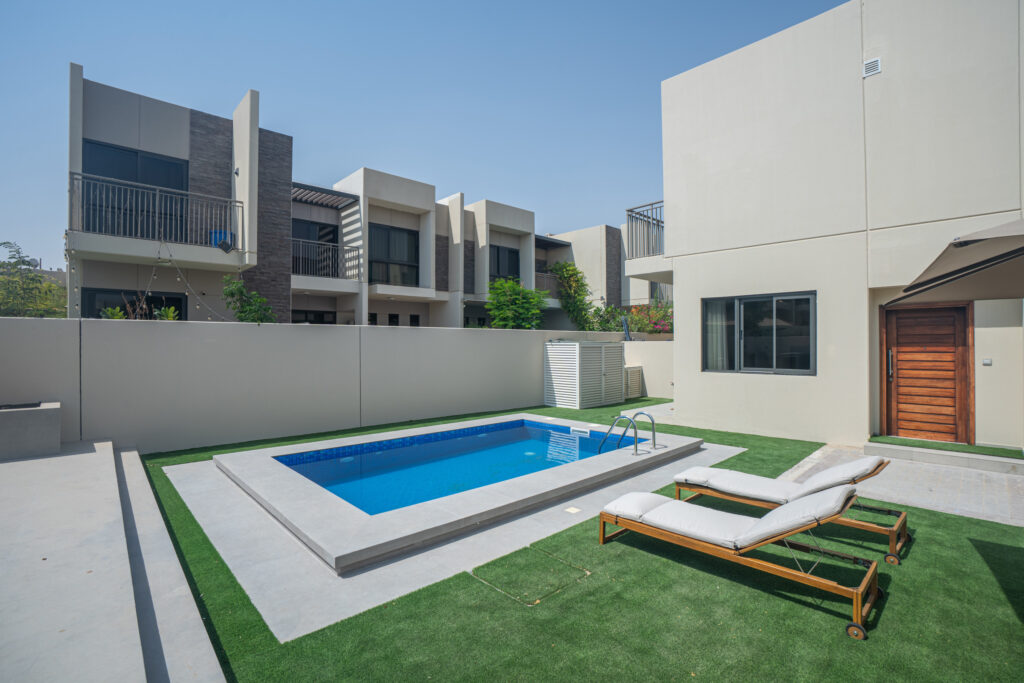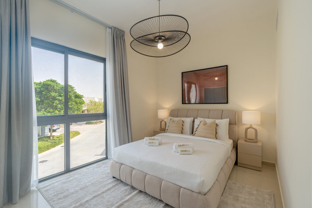 This contemporary townhouse combines comfort and style with bright open spaces, a fully equipped kitchen, and a private garden and swimming pool ideal for outdoor dining or quiet evenings. Set within a tranquil community, guests can enjoy access to modern facilities while being just a short drive from Dubai’s main attractions.