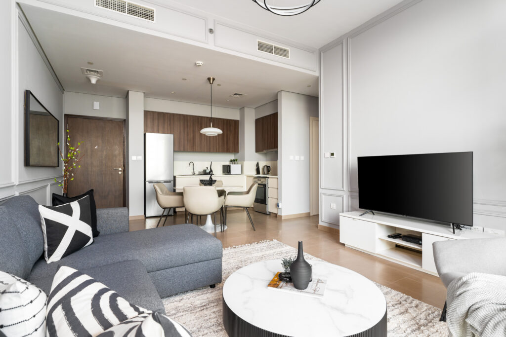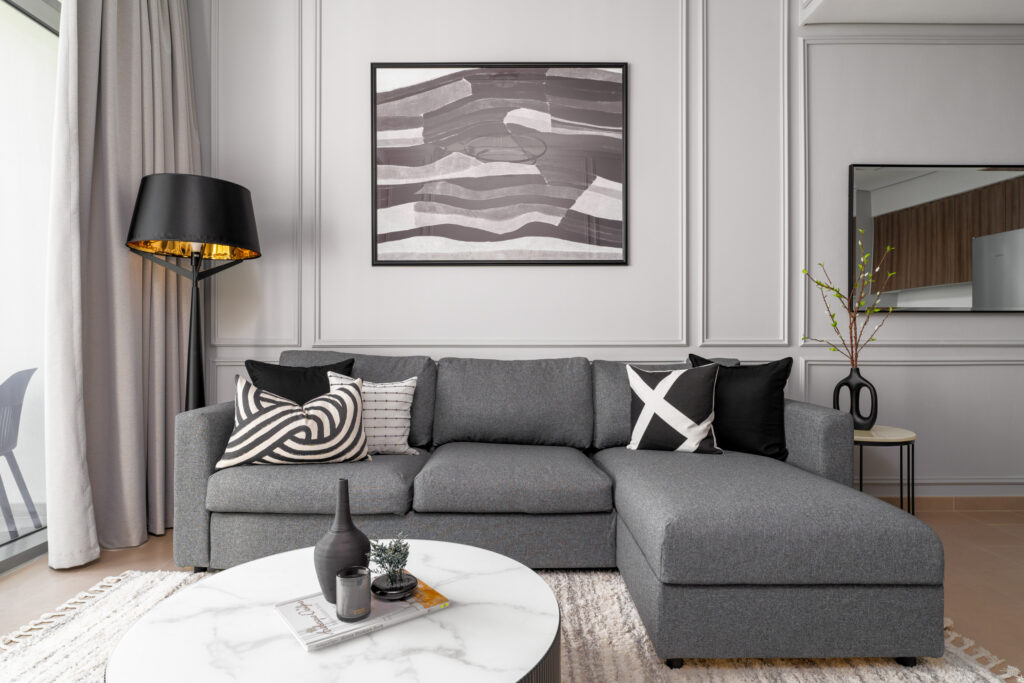 • Tranquil and bright living area with cosy L-shaped sofa, marble top coffee table, and smart TV