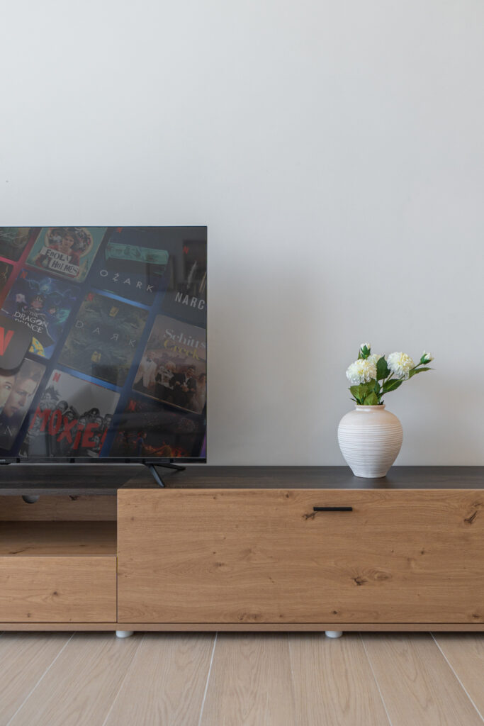 • Bright open-plan living space with comfortable sofa and Smart TV