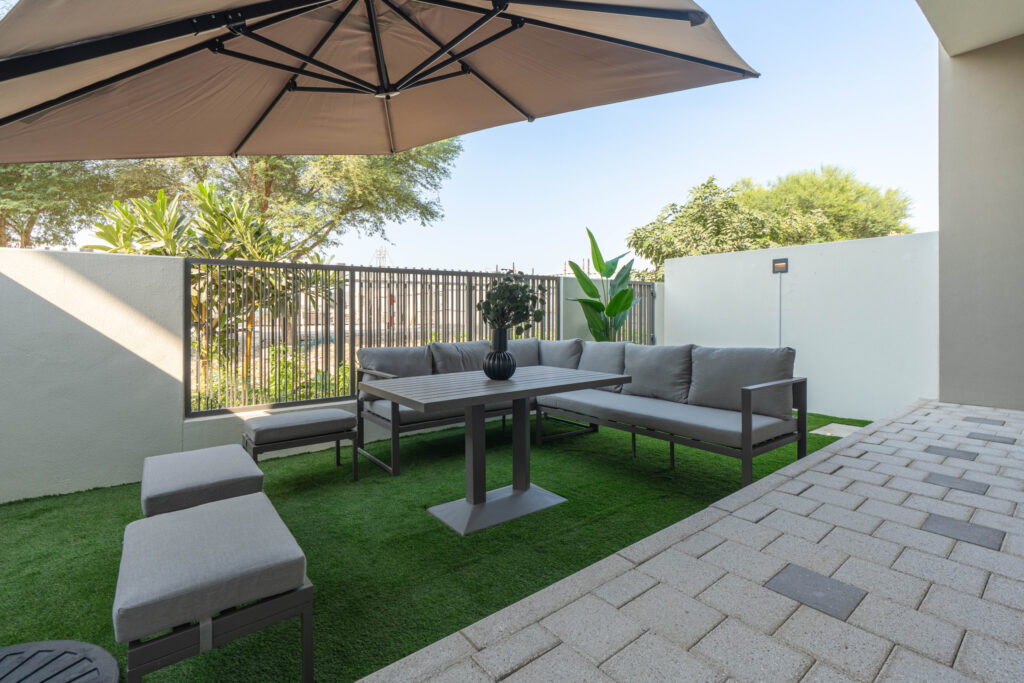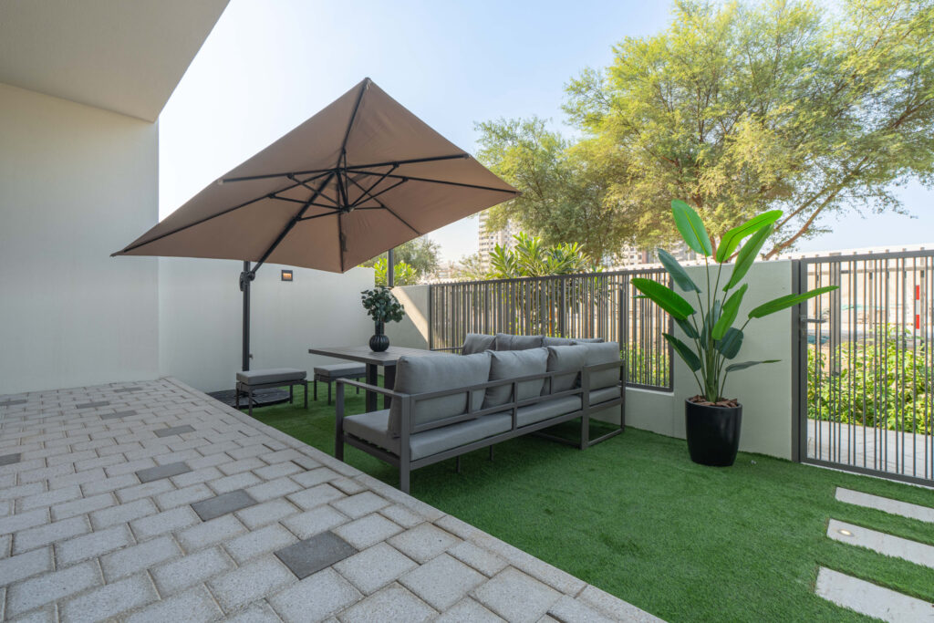 haus & haus holiday proudly presents this beautifully furnished 3 Bedroom + Maid’s Room Townhouse in Aura 3, located in the highly sought-after community of Tilal Al Ghaf.