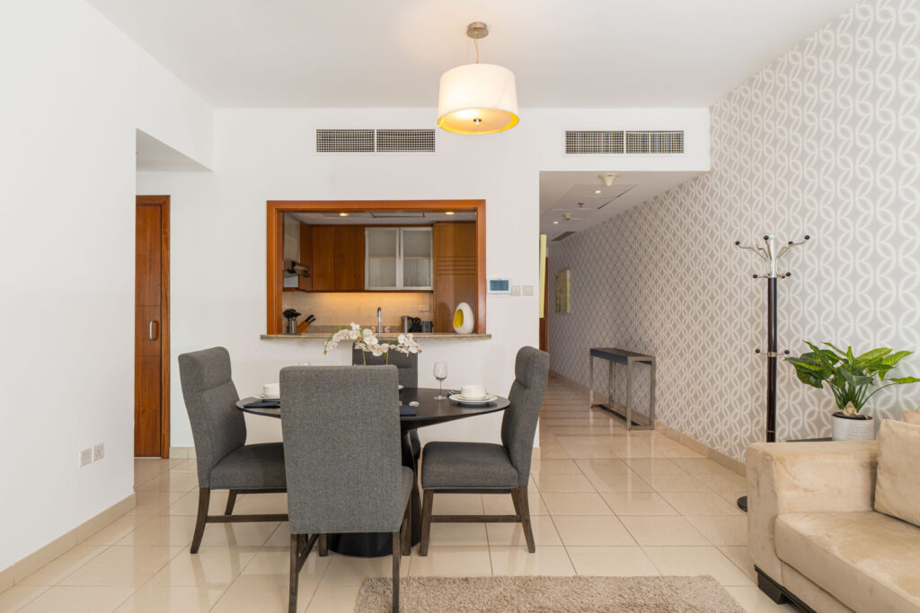 The apartment is fully equipped and features comfortable interior, designed to provide a relaxing retreat after exploring the dynamic surroundings of Downtown Dubai.
