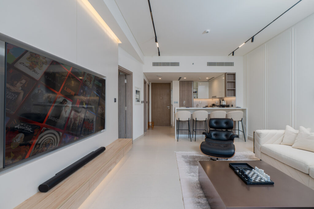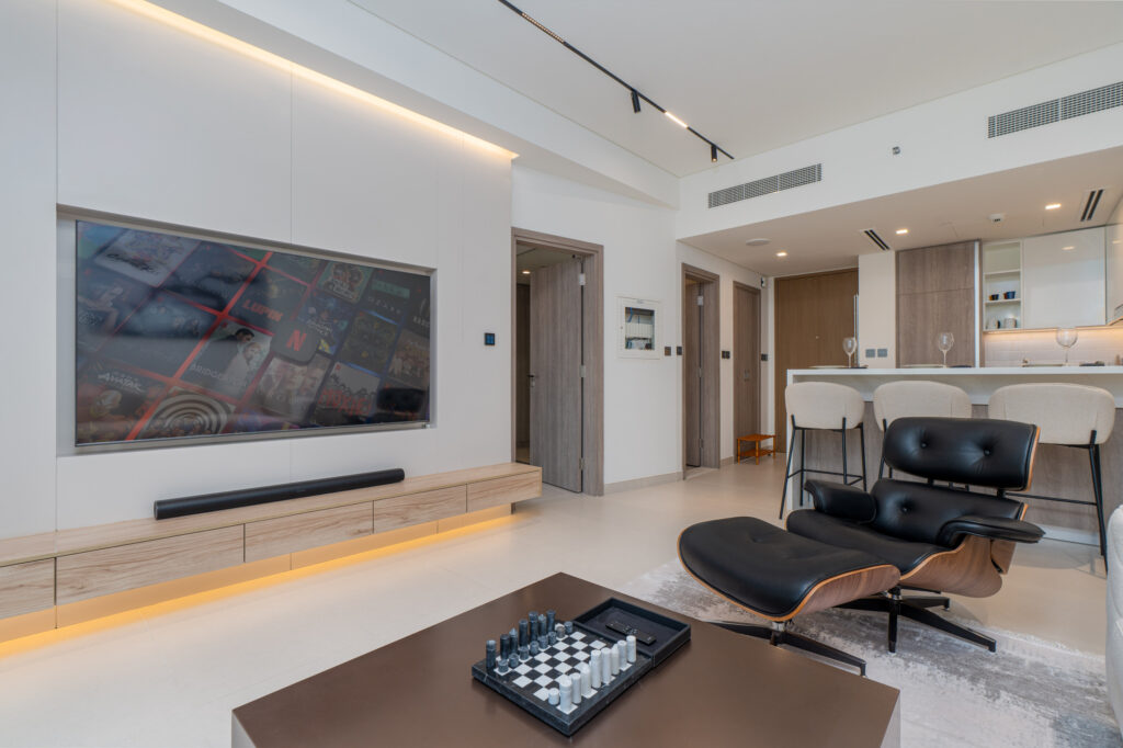 • Elegant living area with a comfortable sofa and smart TV