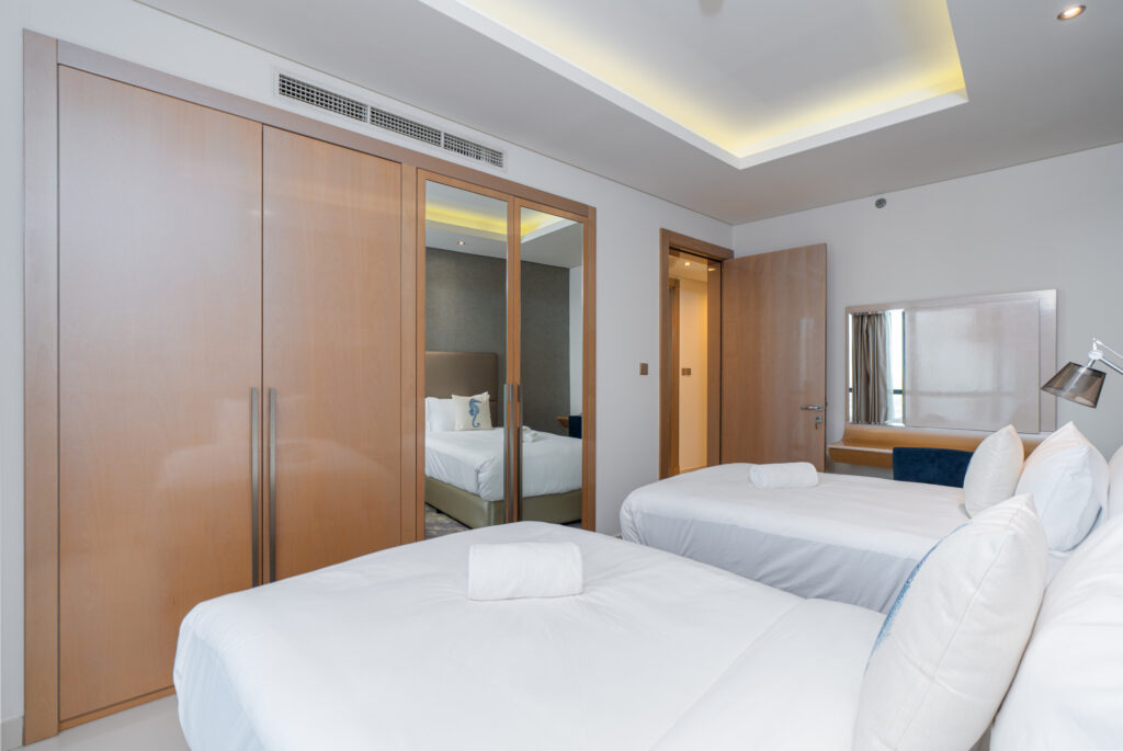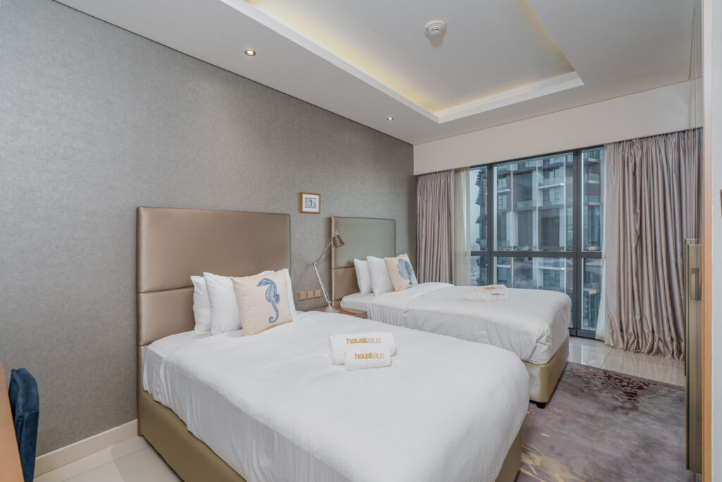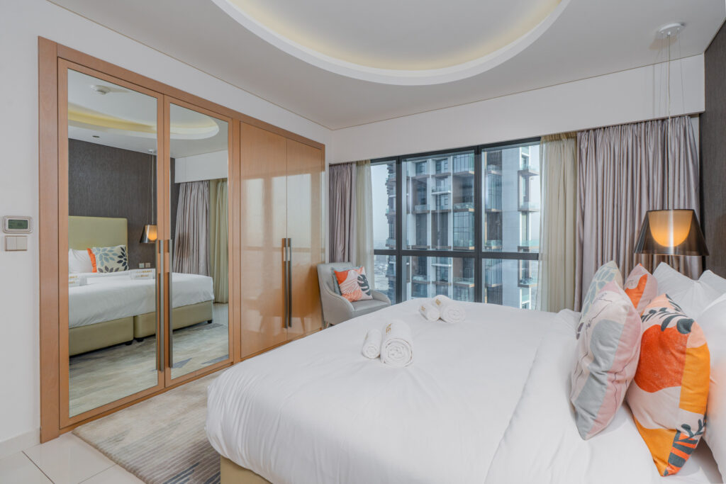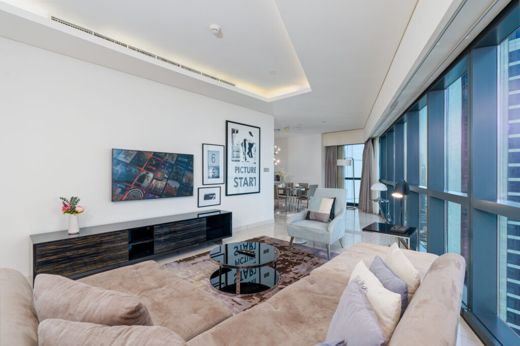Elevated on a high floor, this sophisticated residence offers breathtaking skyline views, including the striking silhouette of the iconic Burj Al Arab in the distance. Inspired by Hollywood glamour and modern elegance, the apartment blends comfort, style, and city energy—perfect for families, friends, or business travellers seeking a premium Dubai stay.