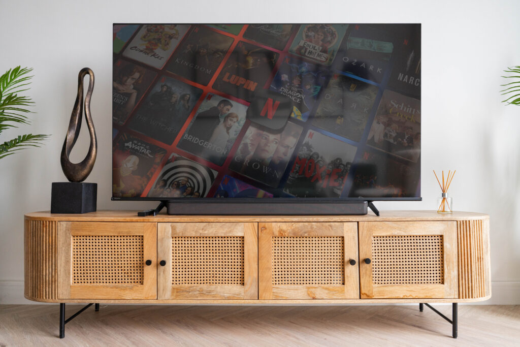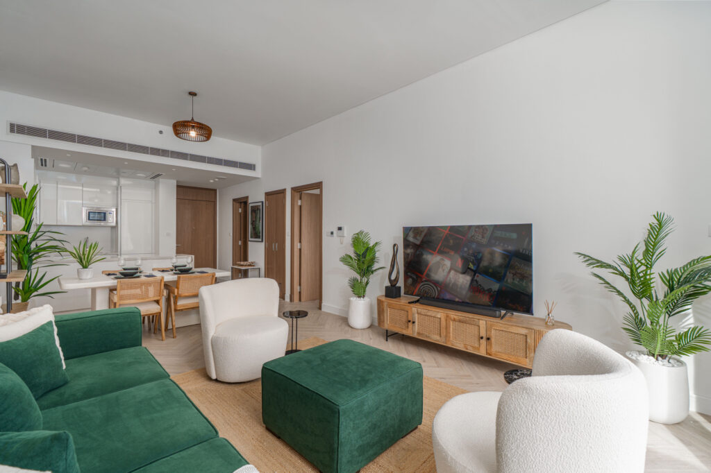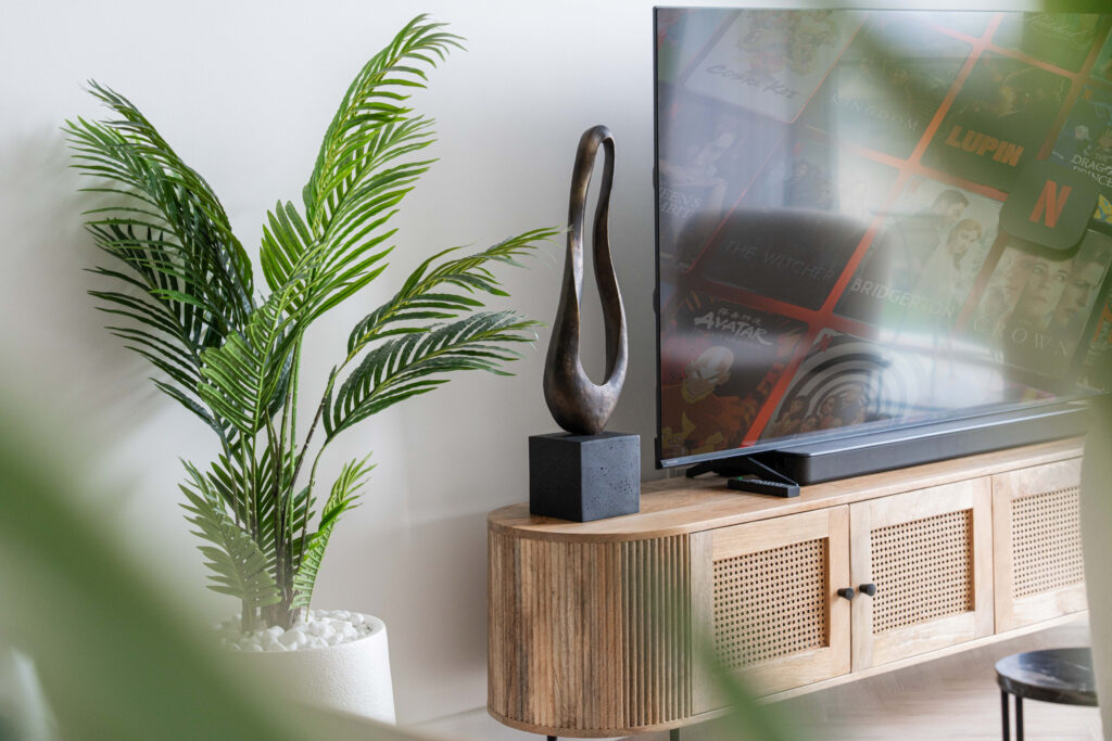 • Bright, airy living space with comfortable seating and a smart TV