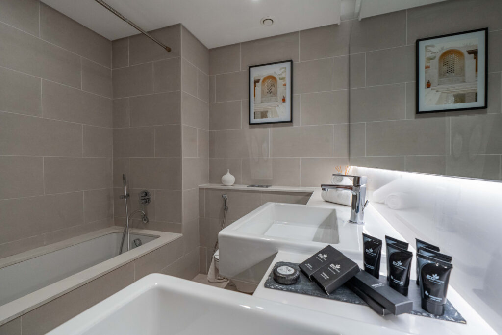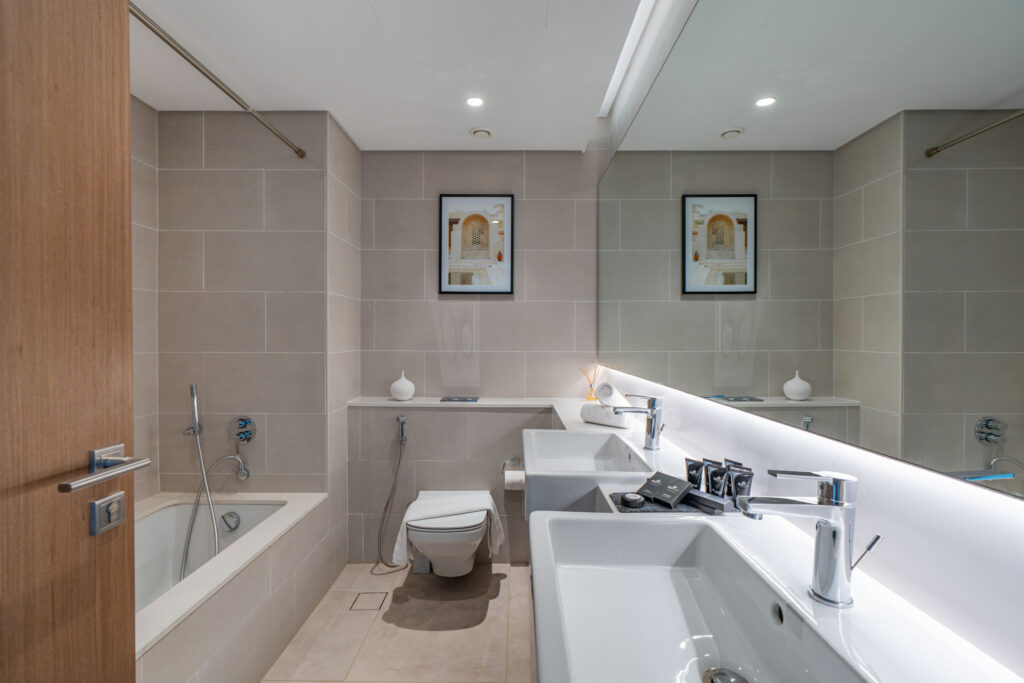• Contemporary bathroom with bathtub, dual sinks, and premium fittings