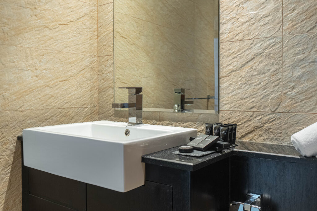 • Contemporary bathroom with sleek fixtures