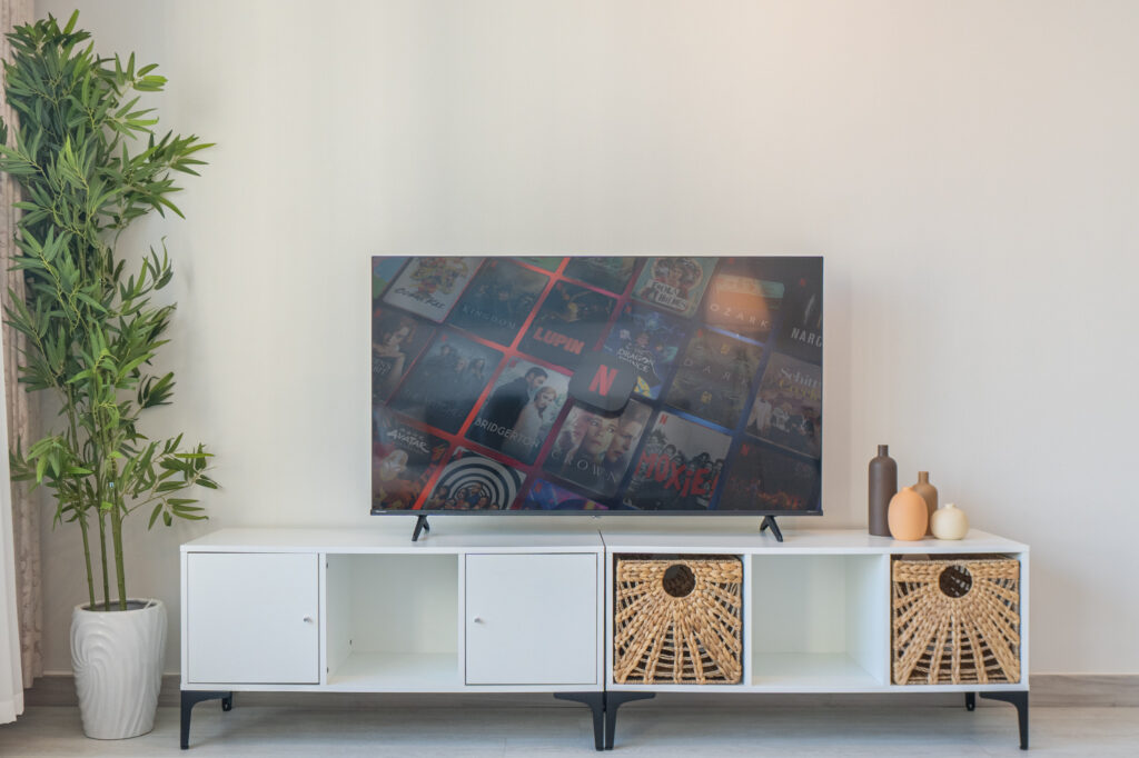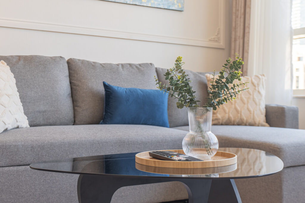 • Bright living area with comfortable seating and Smart TV