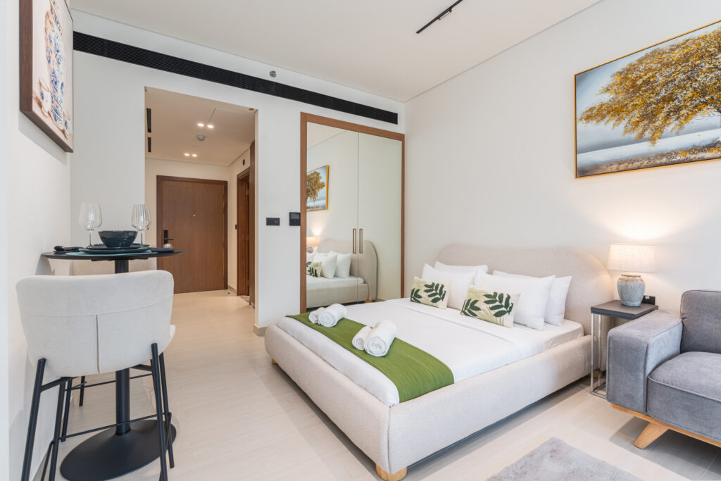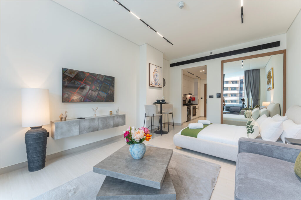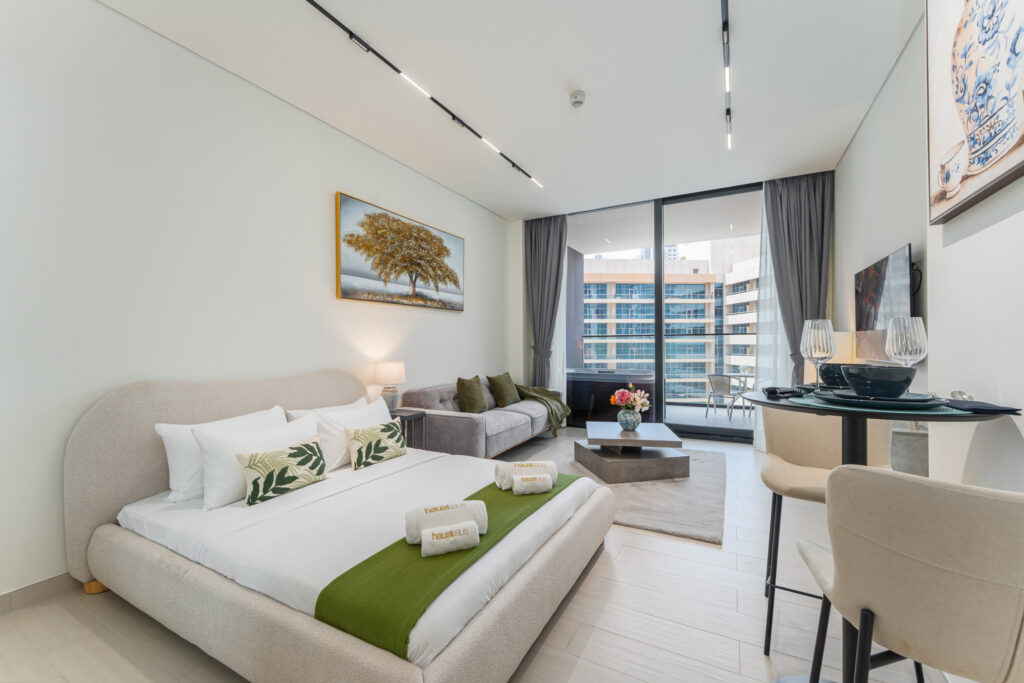 haus & haus holiday proudly presents this stylish studio apartment in Binghatti Trillionaire, Business Bay – where comfort meets contemporary living in the heart of Dubai.