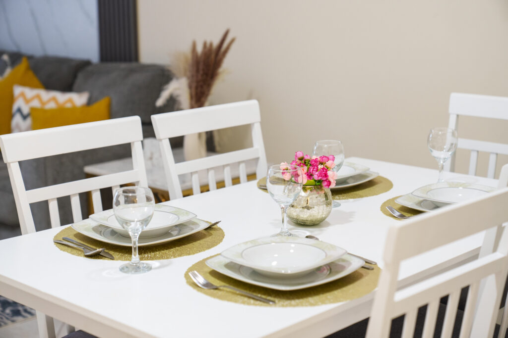 • Wooden dining area that comfortably seats 6 people